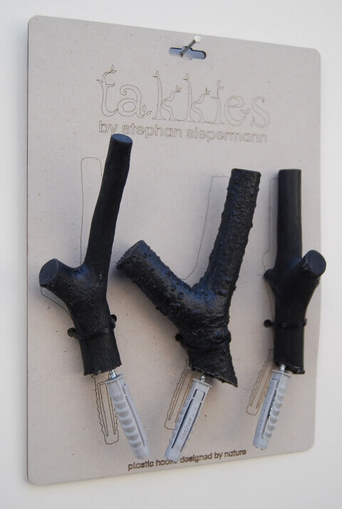Takkies are little wardrobe hooks made of casted plastics. They are exact replicas of real existing small wooden branches found in the forest. moulded in silicones and reproduced. Available in 3 shapes.