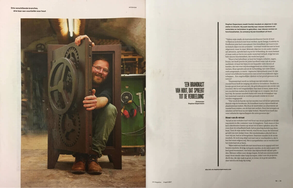 Stephan Siepermann maakt houten meubels en objecten in zijn atelier in Utrecht. Hij zoekt daarbij naar nieuwe manieren om materialen en technieken te gebruiken, naar nieuwe vormen en functionaliteiten. Zo ontwierp hij onder meer een brandkast uit hout.