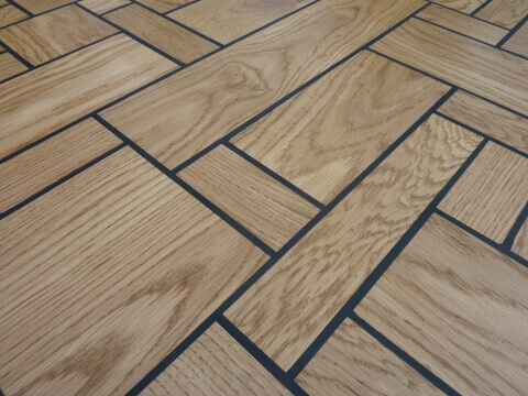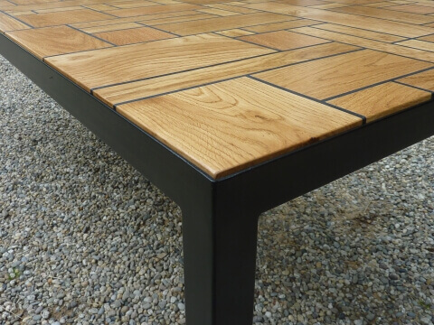 The Kitt table uses kit to glue pieces of oakwood together. This enables the wood to expand and shrink independently without cracking. The result is a beautiful patchwork of wood and black kittlines.