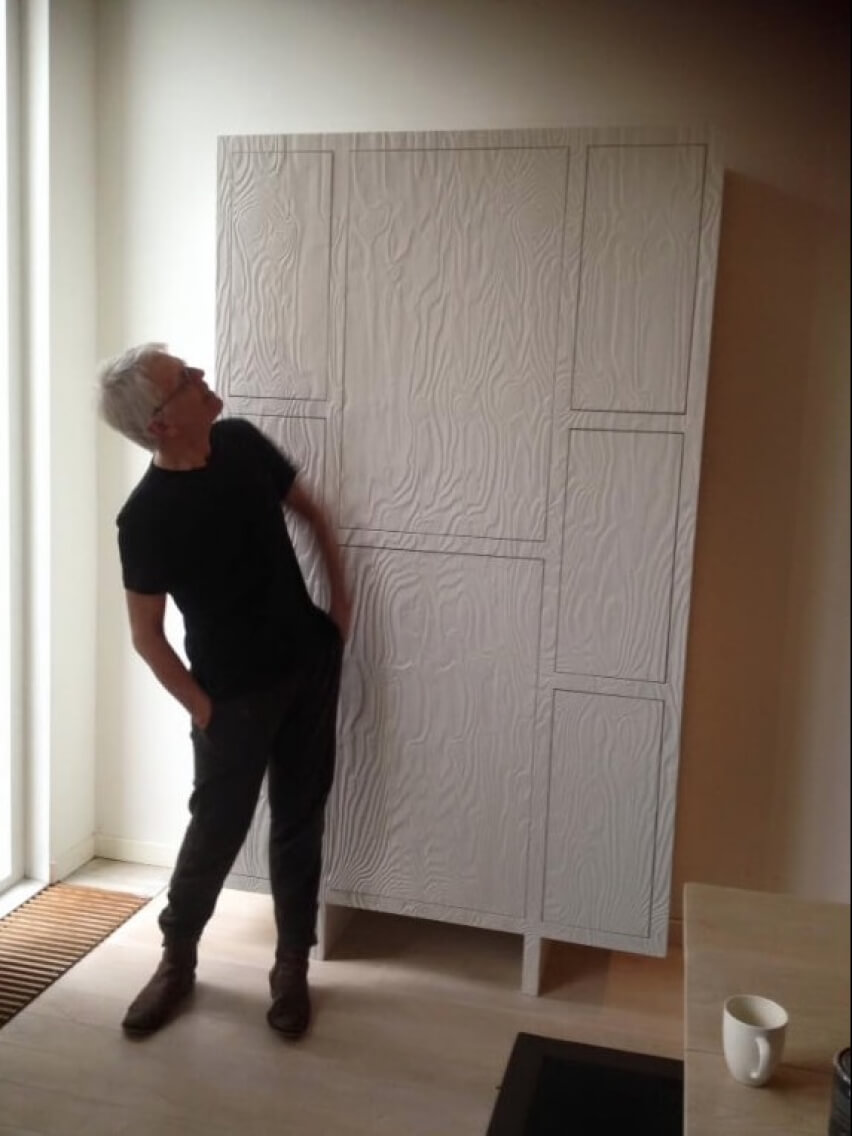 The cabinet is constructed out of one board, so the woodgrains run uninterrupted over the whole piece. A complete new skin for a range of new furniture in various shapes.