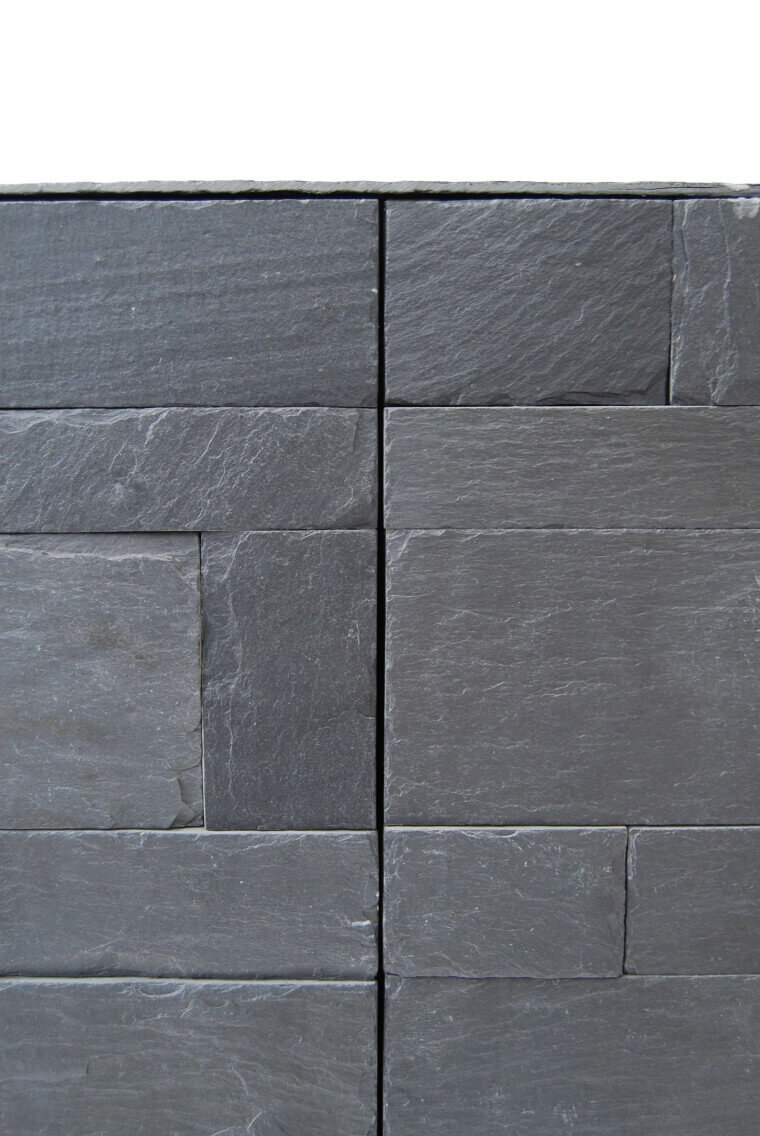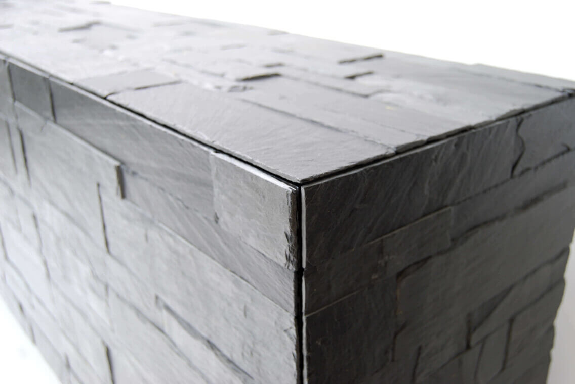 The slate buffet is the first piece within a project of using exterior, architectural materials for interior items. In this first example, beautiful gray slatestone is used as a tile to cover a firm, black, wooden box. The clever 45 degrees solution in the doors make it possible to let the doors sink into the body completely. And this in combination with black automatic hinges and a push-to-open system. An interesting but quite dusty project.