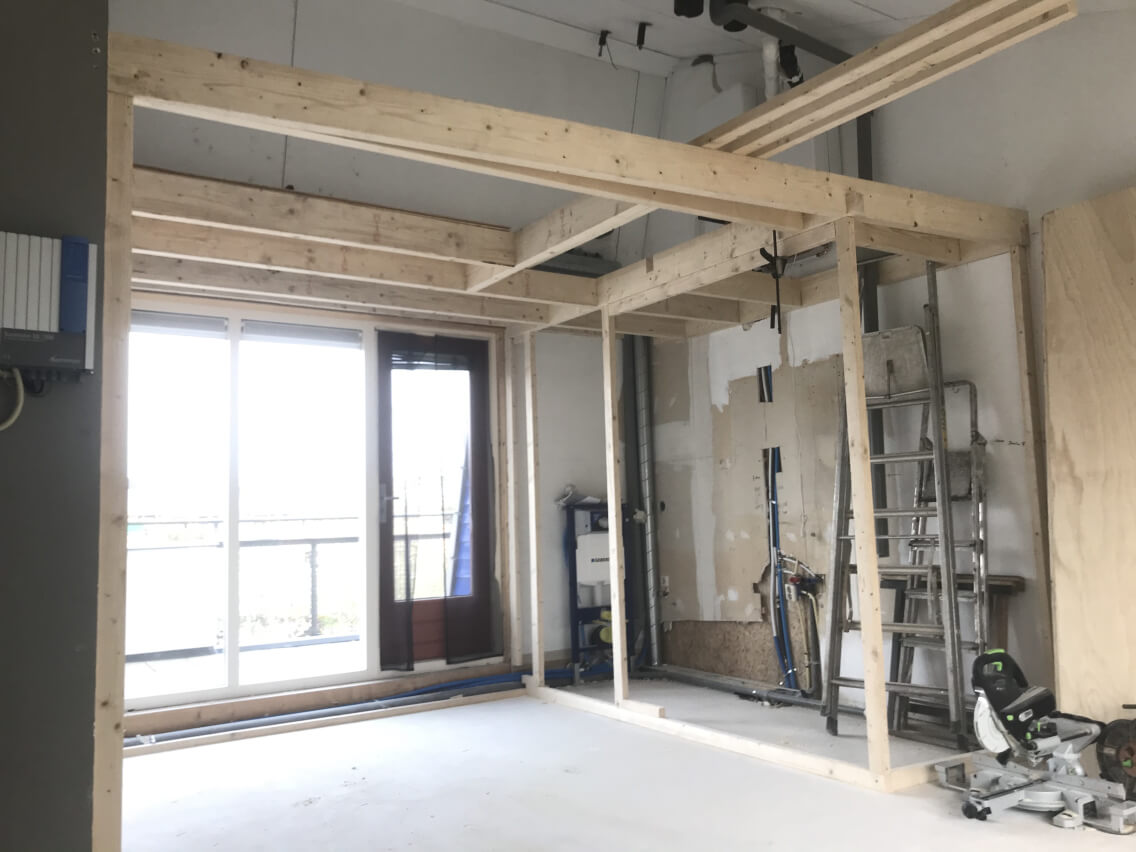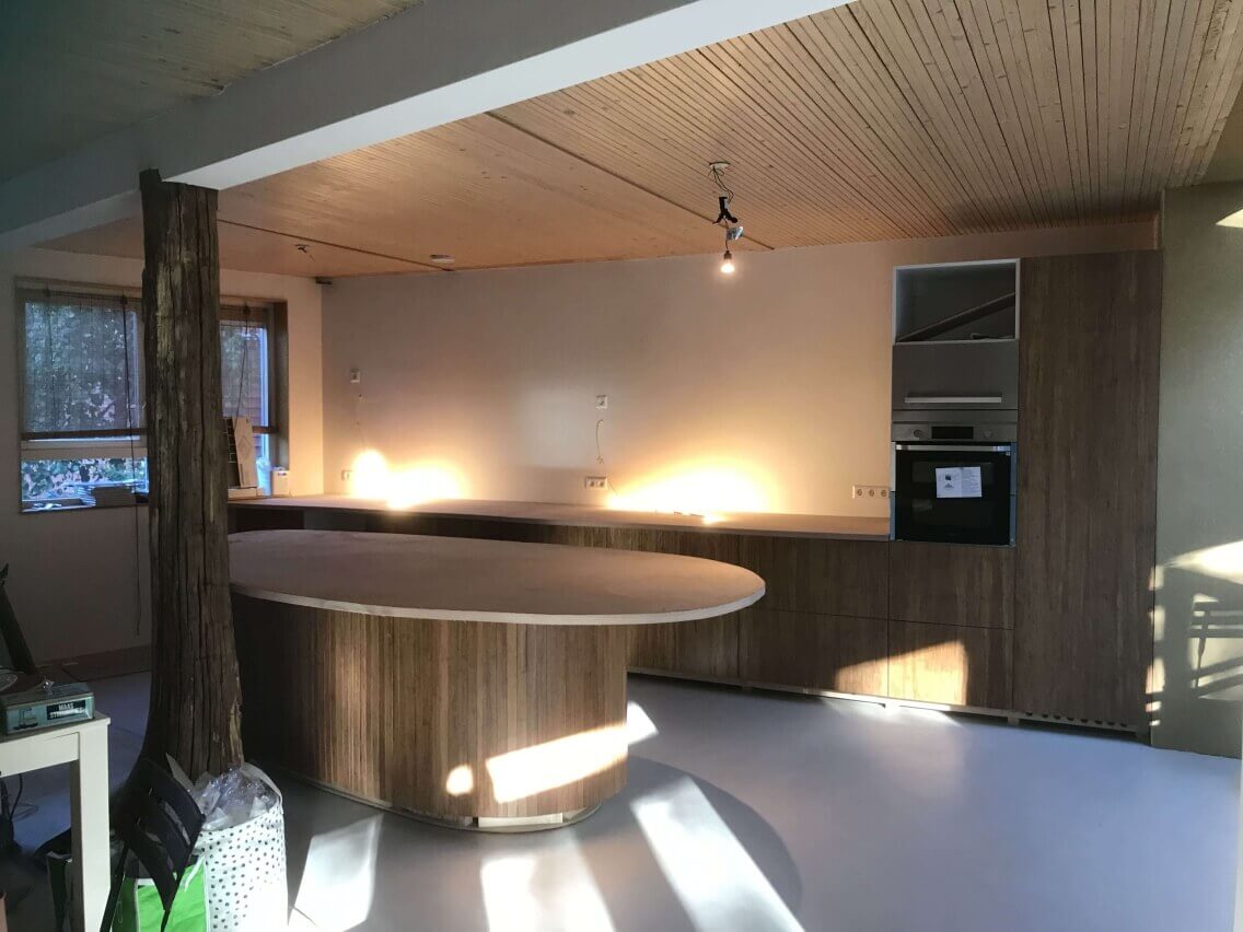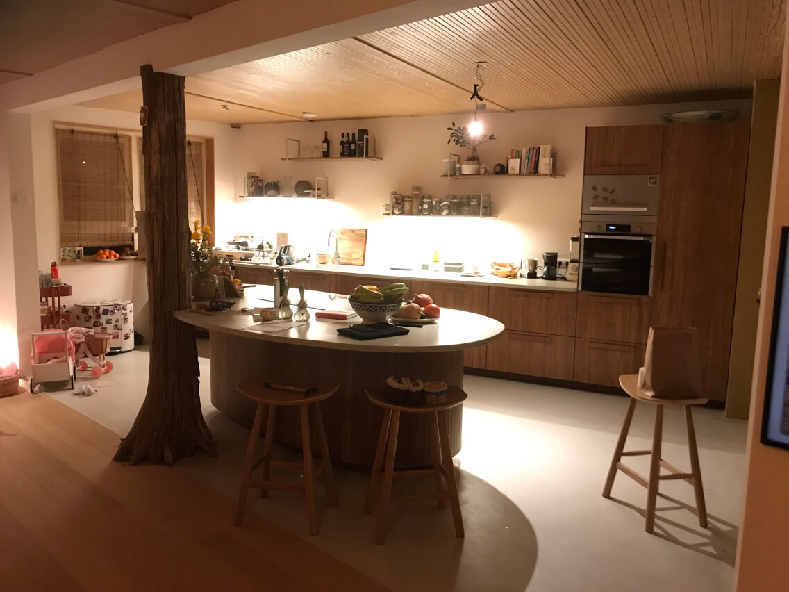 For a private client i designed and produced a kitchen and guestroom with bathroom in Culemborg. The kitchen is situated around an old oak tree wich i arranged for the client. It is the center of the room and it also supports the ceiling instead of an ugly column which was there before. The guestroom on the second floor is completely made out of radiplex, including the ceiling, floors, stairs and walls.