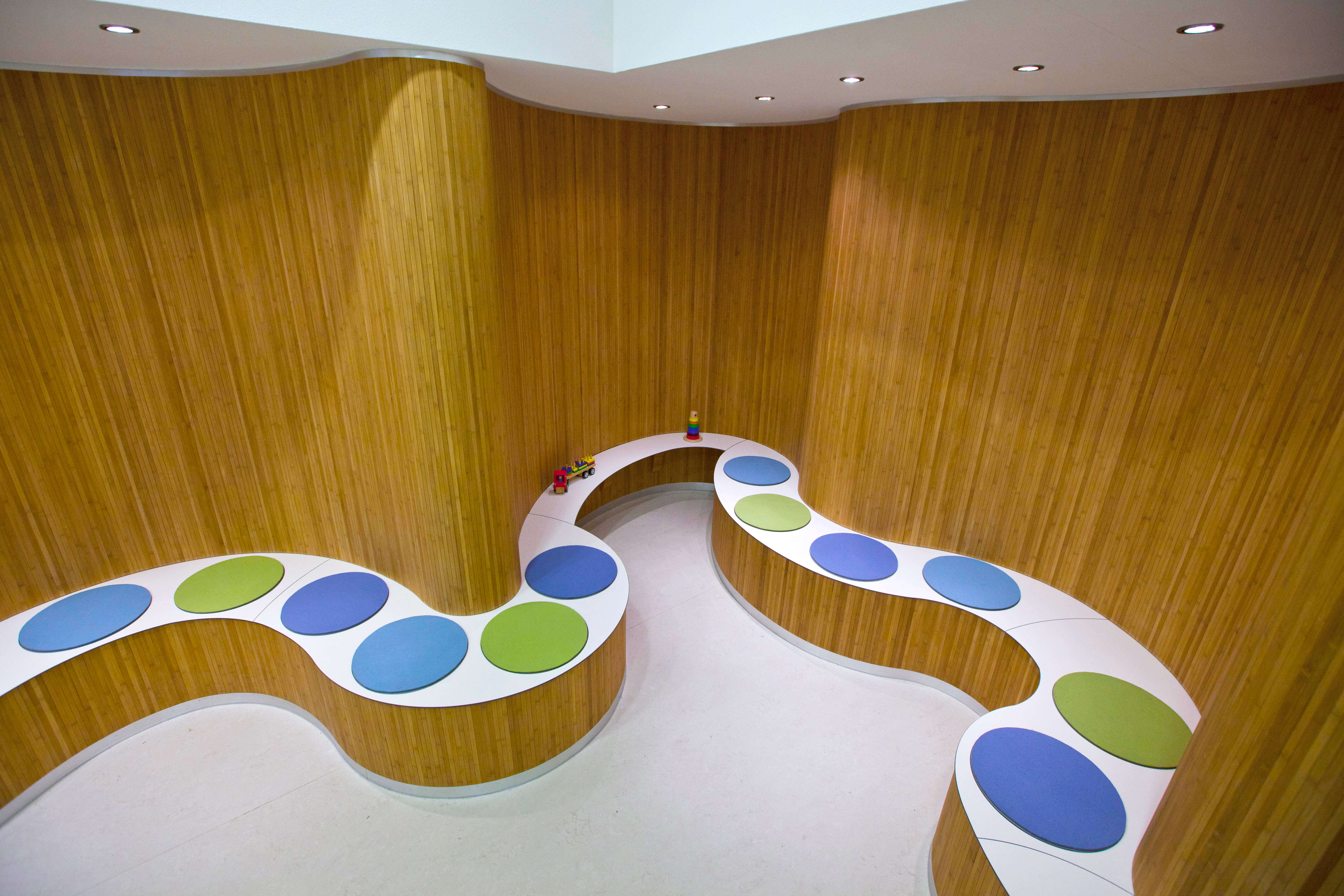 Once again i realized a big interior project together with 1op1archticten in Amsterdam, and again it is a midwivesoffice. It is called Groei and is located in the heart of Slotermeer. Its a beautiful curvy interior with a few interesting features. This time architect Rosman asked me to build in a quite new material i had never worked with; bamboo veneer from moso. Its an interesting material of 17 mm wide, 2 mm thick bamboo strips, glued on a thin layer of textile.
