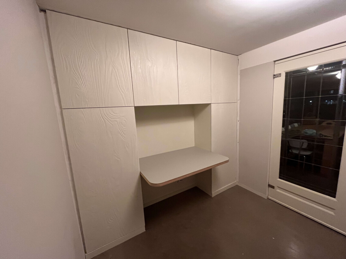 I have a friend who lives on a houseboat in Amsterdam with his wife and two kids. A boat has often limited space so that's why they asked me to transform a part of their livingroom into a clever homeoffice. In the room there was a big open cabinet which i transformed into a closed one with an integrated office table. On the other side of the room i made a large desktop with underneath some drawers and some more hidden storagspace.