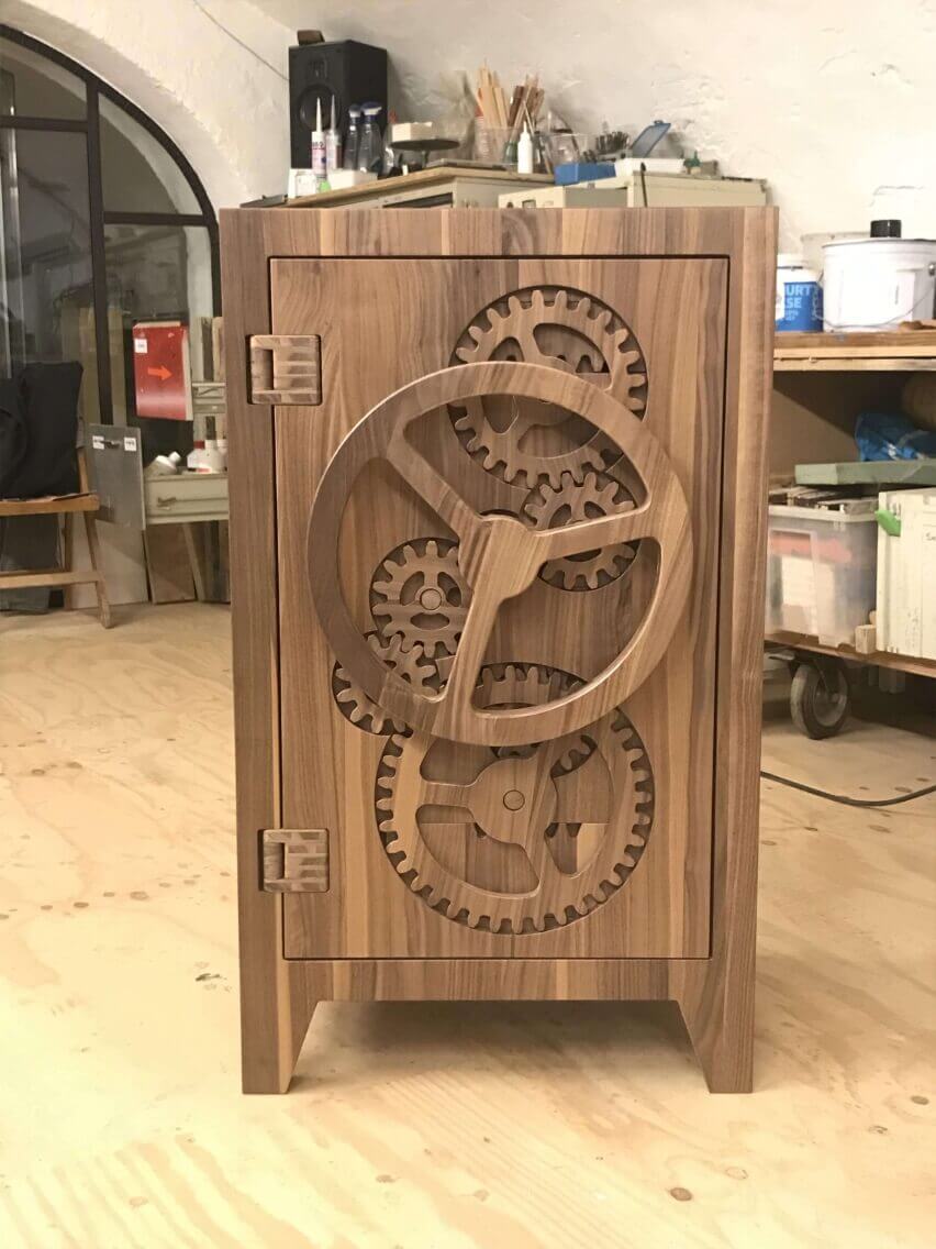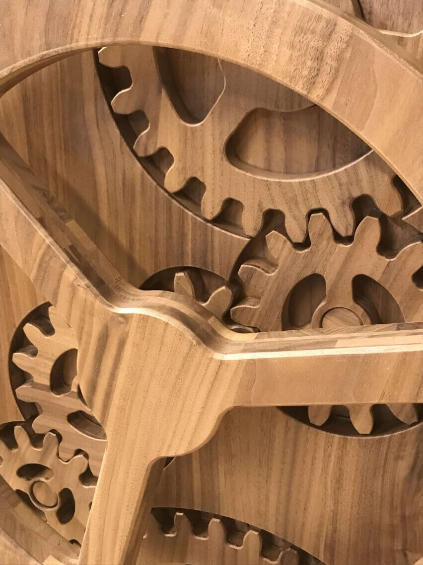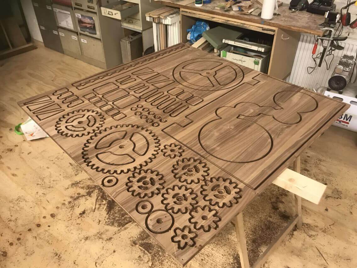 I always had the dream to produce mr.knox in solid wood. The problem is that the gears have to stay perfectly round to keep working correctly. Solid wood is just not usable beacuse of the natural proces of expanding and shrinking. Because of that i always use stable plywood for mr.knox. But now i found a material from austria which has the benefit of both worlds. Solid walnut plywood! Not cheap but it works just great!