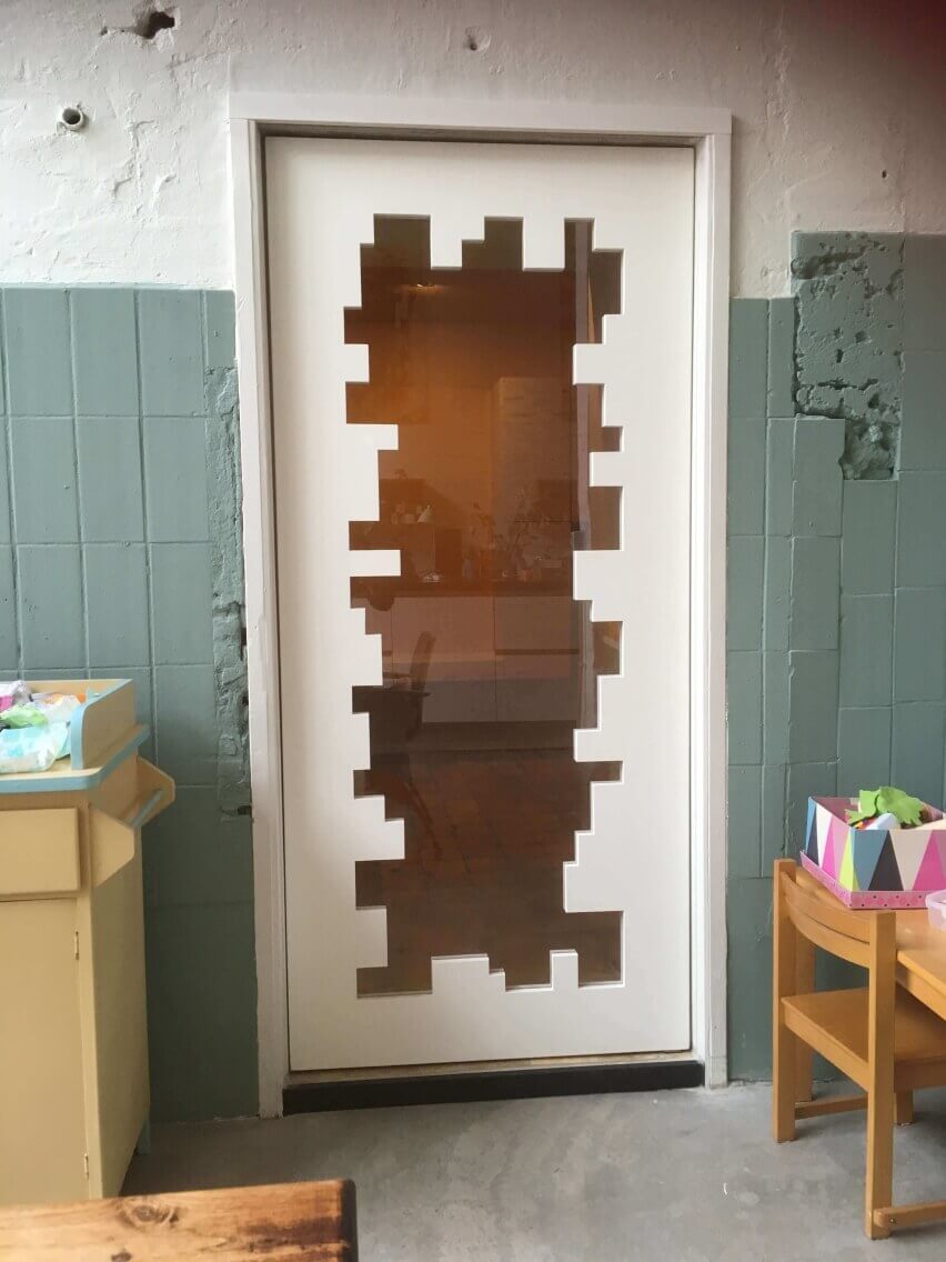 Hmmmmmm.....well....the answer came quick. I designed a 'snake cabinet' where all the functions are determined by the height, depth and volume of the cabinet. A elongated one-piece snakelike object. I used a friendly light material and bright colours to make the room friendly and inviting. Last but not least i designed a swiniging saloondoor which fits the formlanguage of the room.