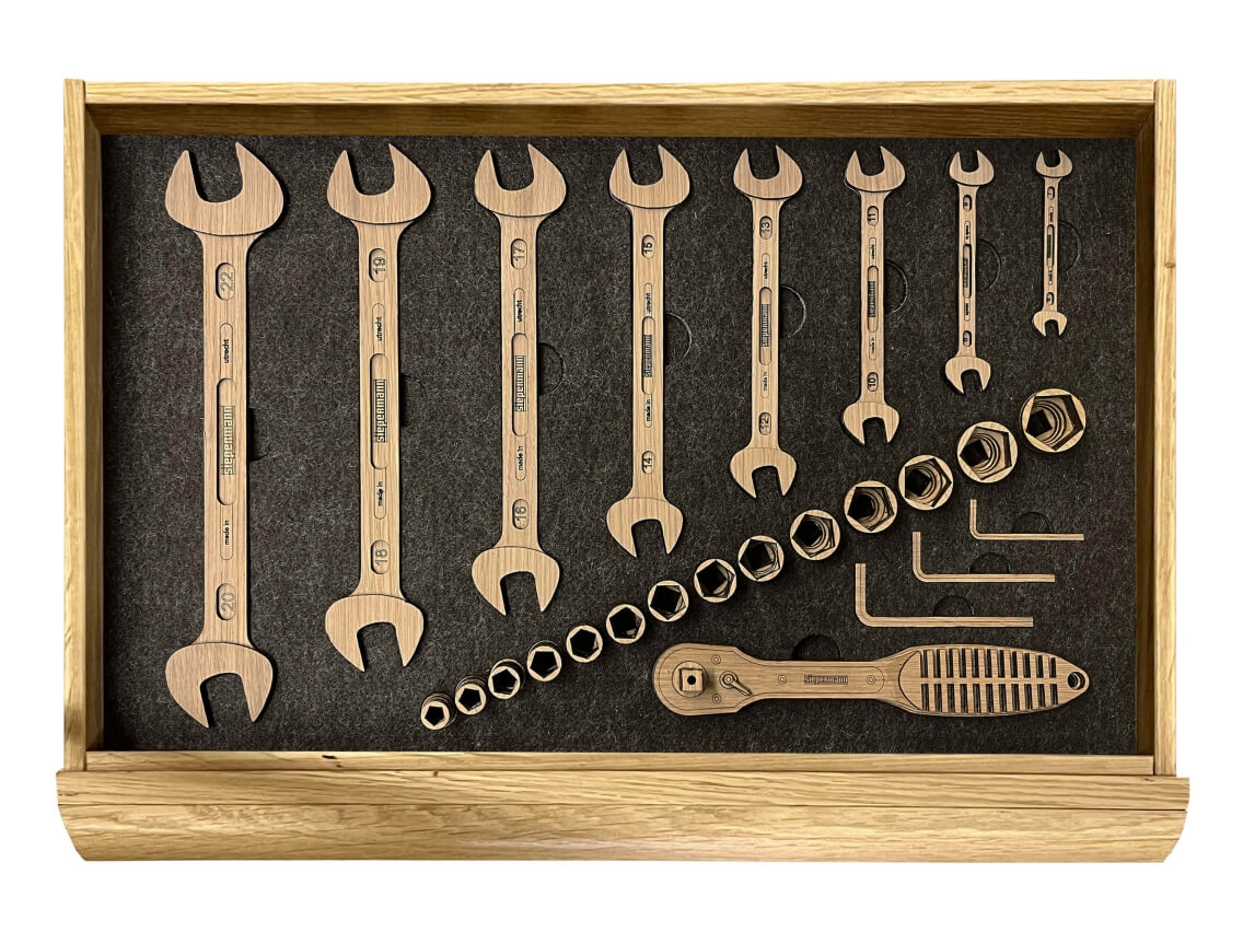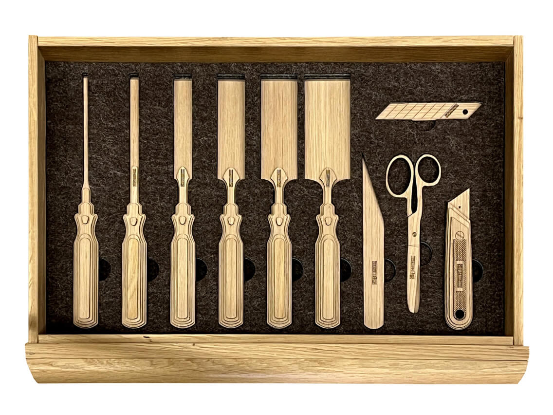 At this moment i only have filled the first 2 drawers. It takes a lot of time to measure, draw and produce this little wooden tools. In the next few years i will fill all drawers with wooden tools. The proces will be guided by the tools i use myself the most in my own workshop. When finished, it will of course also be for sale, completely filled with the whole set of wooden Siepermann tools.